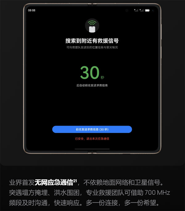 支持,華為Mate X7業(yè)界首發(fā)無(wú)網(wǎng)應(yīng)急通信21,不依賴地面網(wǎng)絡(luò)和衛(wèi)星信號(hào),突遇塌方掩埋、洪水圍困,專業(yè)救援團(tuán)隊(duì)可借助700MHz頻段及時(shí)溝通,快速響應(yīng),多一份連接,多一份希望。