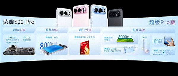 性能方面,榮耀500 Pro搭載了驍龍8 Elite芯片是真正超級Pro級別的性能配置,它還升級搭載了榮耀幻影引擎3.0,通過獨創(chuàng)渲顯分離技術帶來超Pro級的穩(wěn)幀體驗。