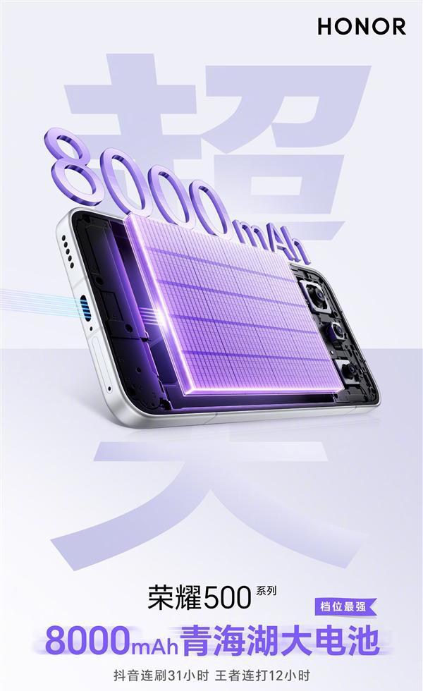 榮耀500在保持6.55英寸的輕薄手感下,全系采用8000mAh青海湖大電池,實現同檔位最大電池配置。
