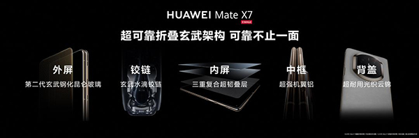 Mate X7機(jī)身架構(gòu)實(shí)現(xiàn)革命性突破,搭載超可靠折疊玄武架構(gòu),可靠不止一面。第二代玄武鋼化昆侖玻璃外屏[ HUAWEI Mate X7典藏版外屏采用第二代玄武鋼化昆侖玻璃。