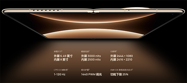 屏幕作為折疊屏的核心交互載體,同樣達(dá)到旗艦級水準(zhǔn),內(nèi)外屏均搭載華為最新的臨境顯示技術(shù),外屏:6.49英寸OLED,2444×1080,高達(dá)3000 nits峰值亮度;內(nèi)屏:8英寸OLED,2416×2210,最高2500nits。