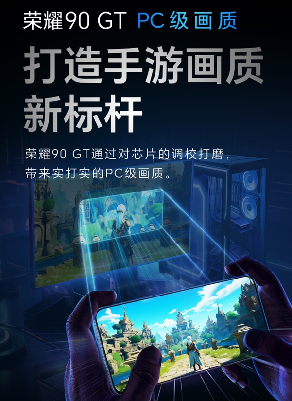 就在今天,官微宣傳海報上赫然標注了:榮耀90 GT將打造手游畫質(zhì)新標桿,通過對芯片的調(diào)校打磨,帶來實打?qū)嵉腜C級畫質(zhì)體驗。