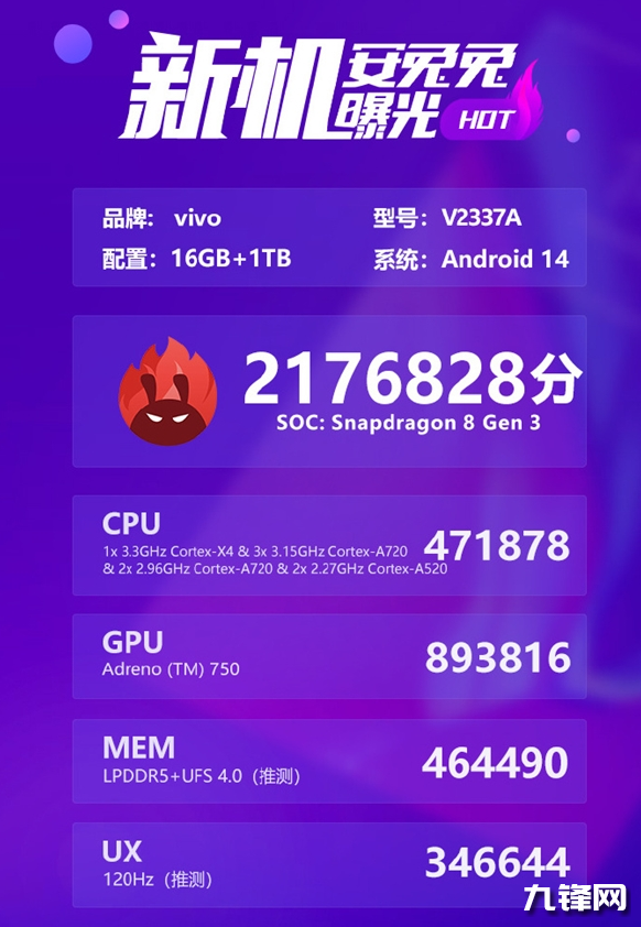 在跑分方面,它的綜合成績?yōu)?176828分,其中CPU部分為471878分,GPU成績893816分,MEM部分為464490分,UX成績則是346644分,整體性能釋放和常規(guī)驍龍8Gen3旗艦機型相當,在折疊屏中屬于最高分數(shù)的水準。